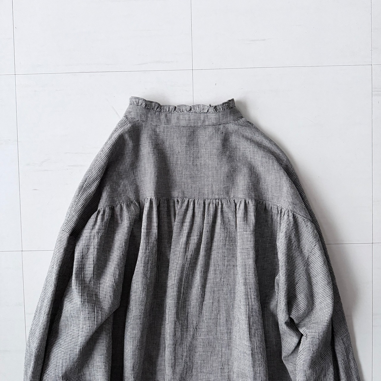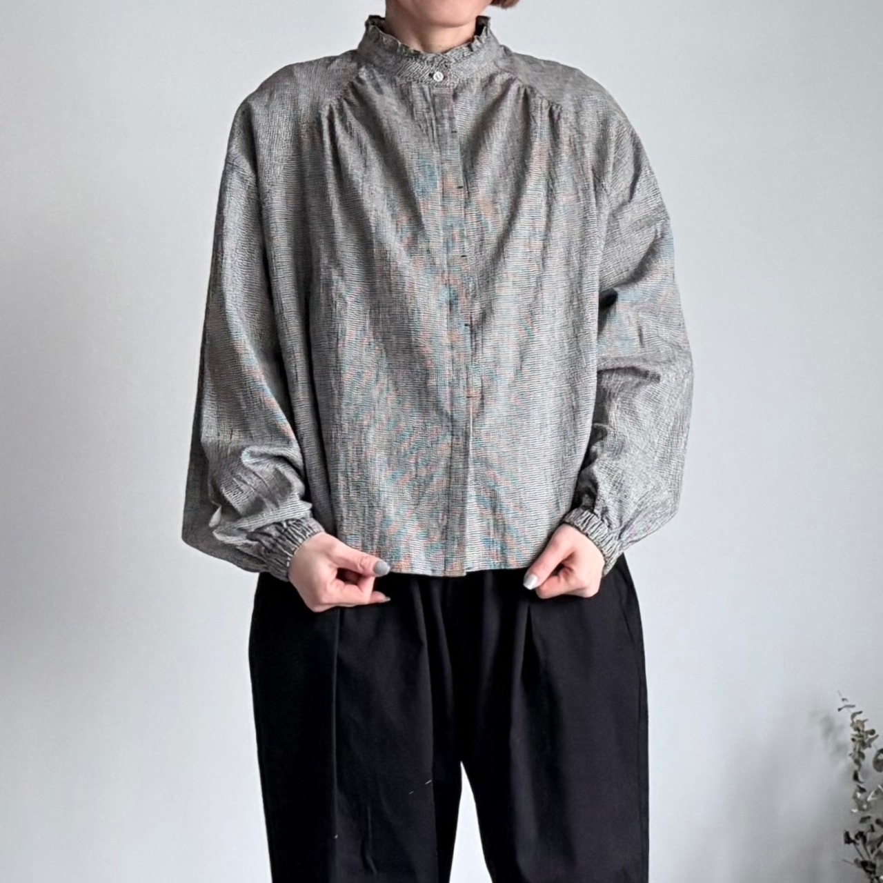 (BASIC)【k-106】バンドカラーフリルブラウス(千鳥格子)