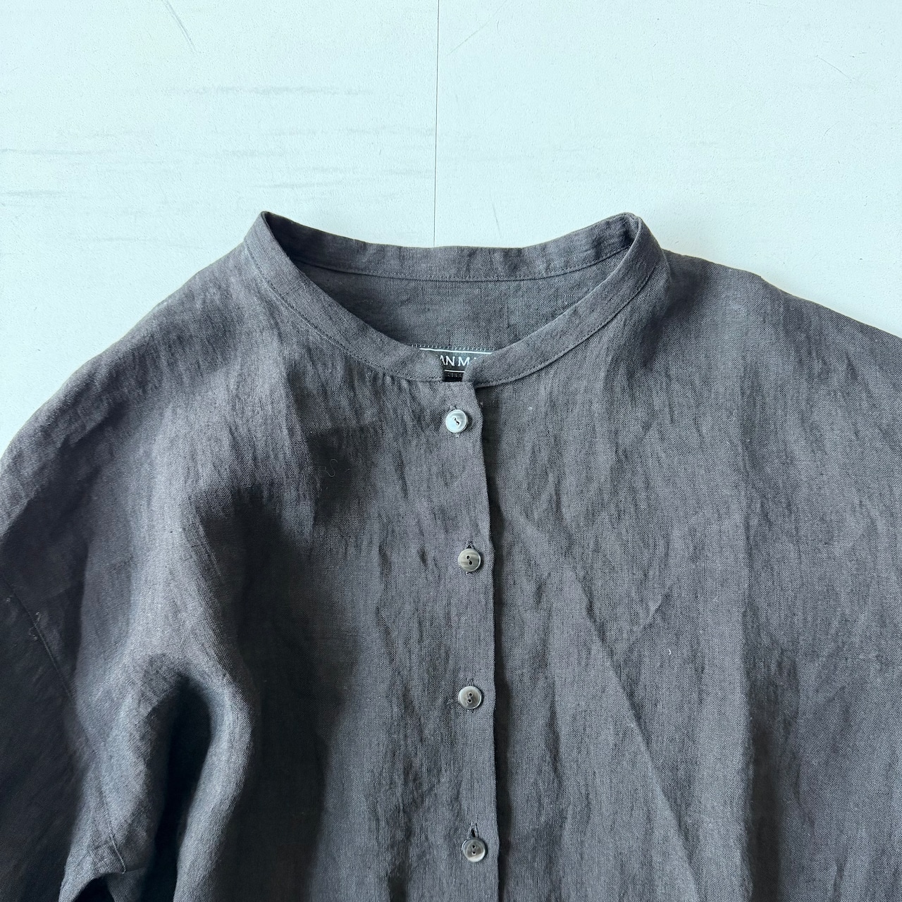 襟は細いバンドカラー。