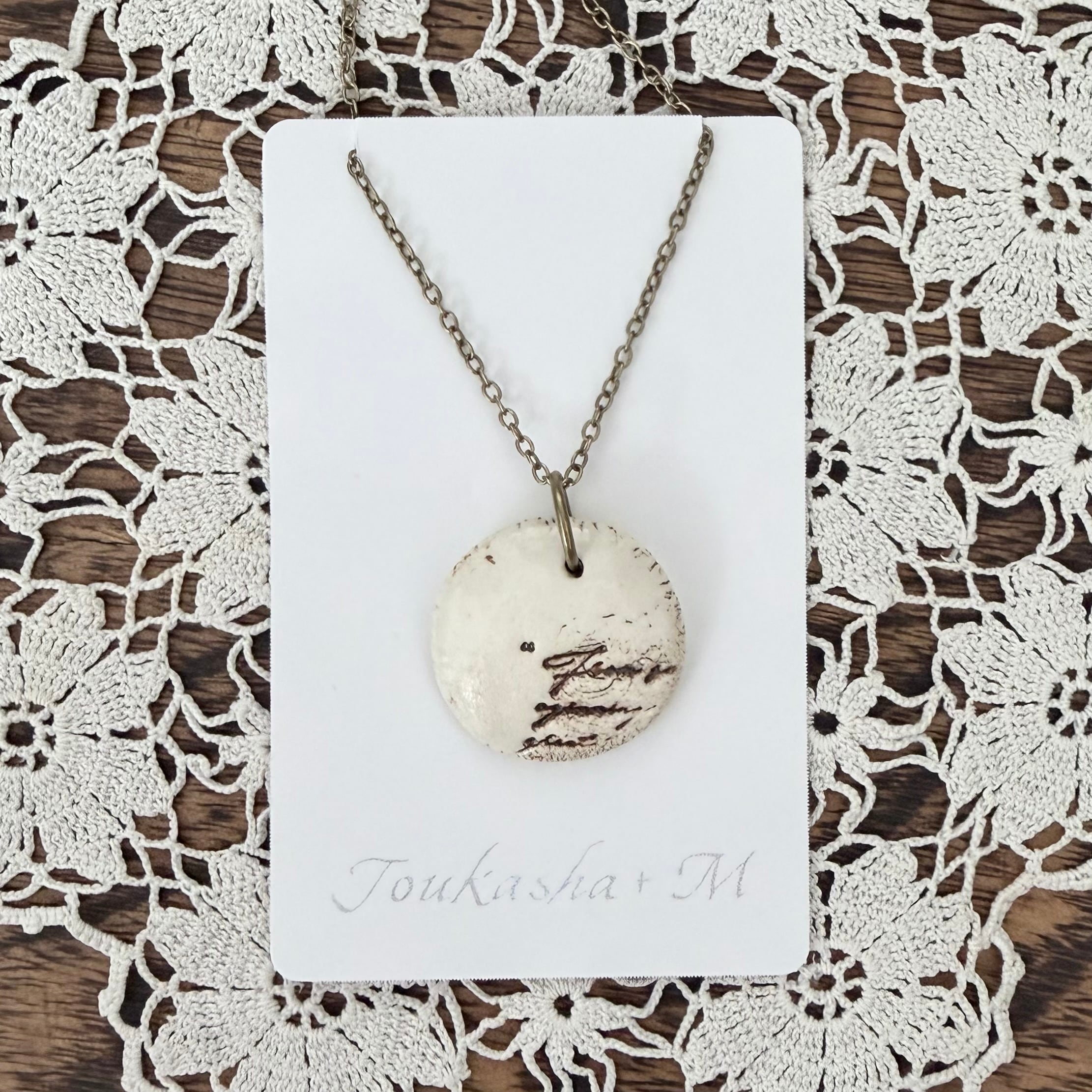 陶器で出来たレタリングの様な刻印のついたデザインの